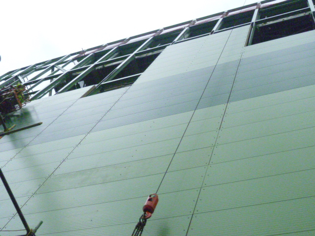 Ce panneau sandwich consiste en deux parements métalliques et une âme en laine de roche. Un voile de fibres noir est inséré entre la laine de roche et la face intérieure perforée afin de bien enfermer les fibres.